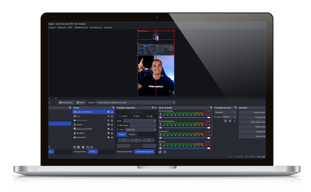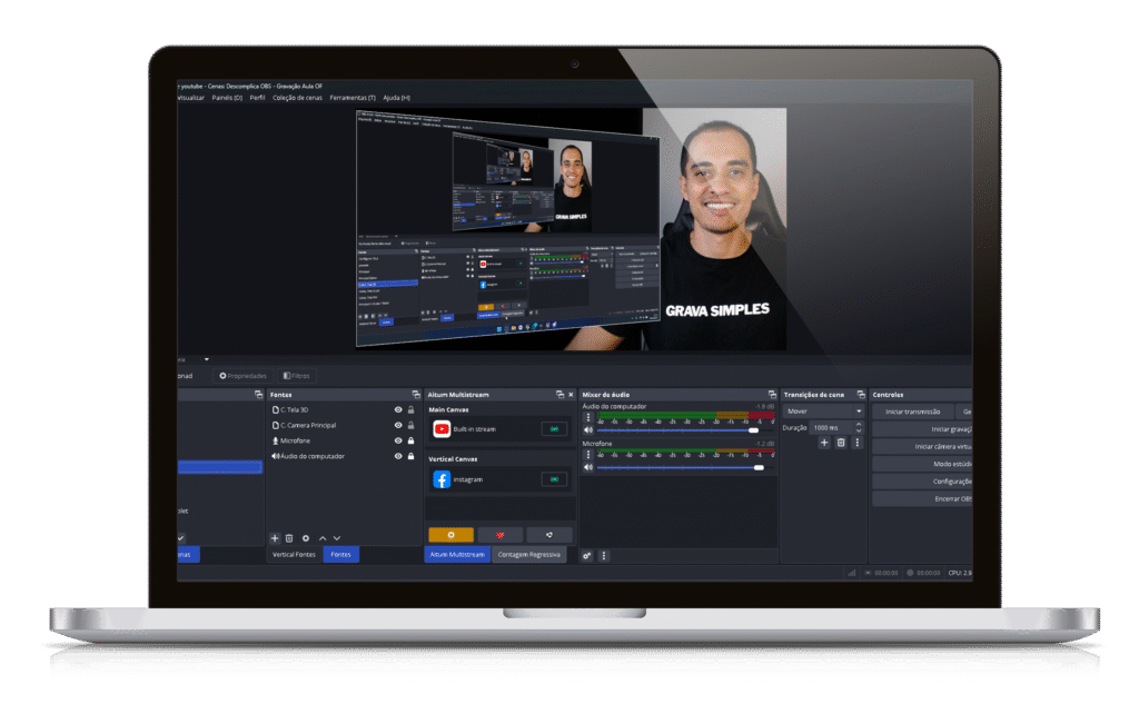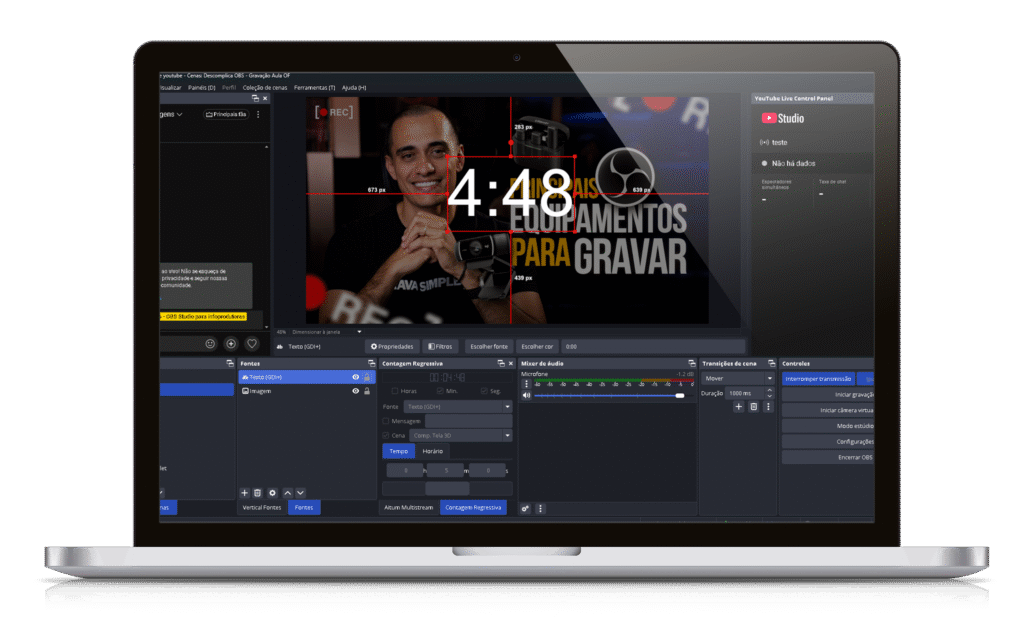 O OBS Studio é um programa gratuito para gravação e transmissão ao vivo, usado por infoprodutores, professores e criadores de conteúdo que, com um notebook, uma webcam simples e um microfone USB, conseguem entregar qualidade profissional.